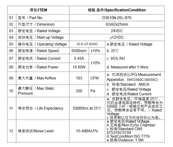 企业首页    风机风扇    DC 风扇    92x92x25mm    D3610N-05L-B76【9225风扇】24VDC 0.45A 6500RPM 直流风扇