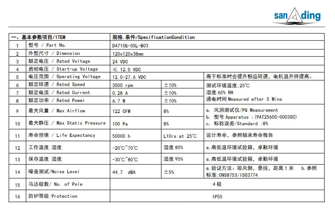 企业首页    风机风扇    DC 风扇    120x120x38mm    D4715E-05L-B03【12038风扇】24VDC 0.28A 3500RPM 直流风扇