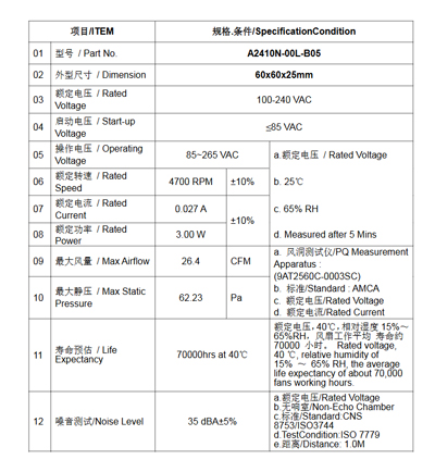 企业首页    风机风扇    EC 风机    60x60x25mm    A2410N-00L-B05【6025风扇】220VAC 0.03A 4700RPM 交流风扇